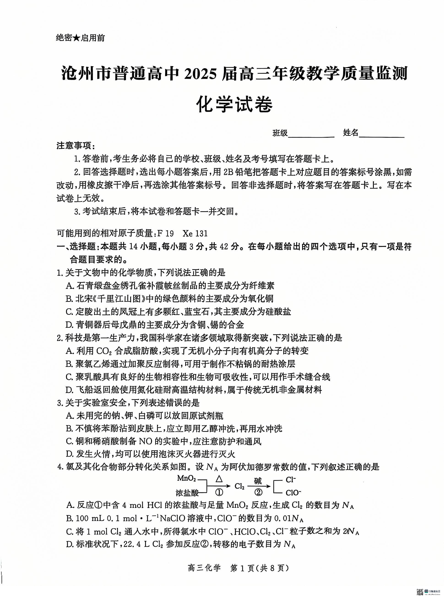 河北省沧州市普通高中2024-2025学年高三上学期12月教学质量监测化学试题.pdf