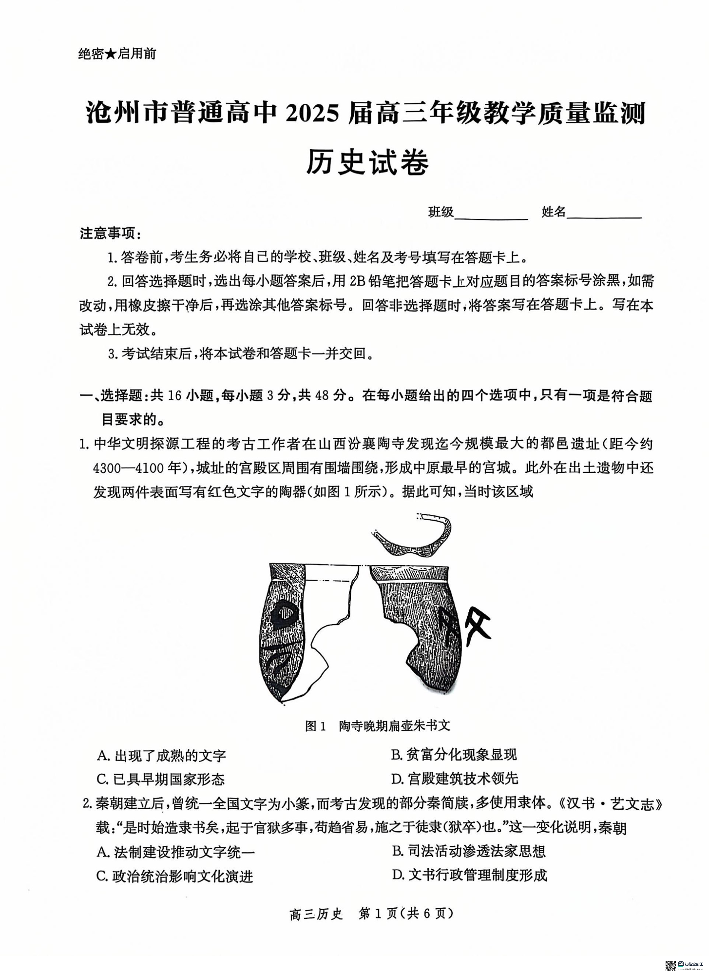 河北省沧州市2024-2025学年高三上学期12月教学质量监测历史试题.pdf