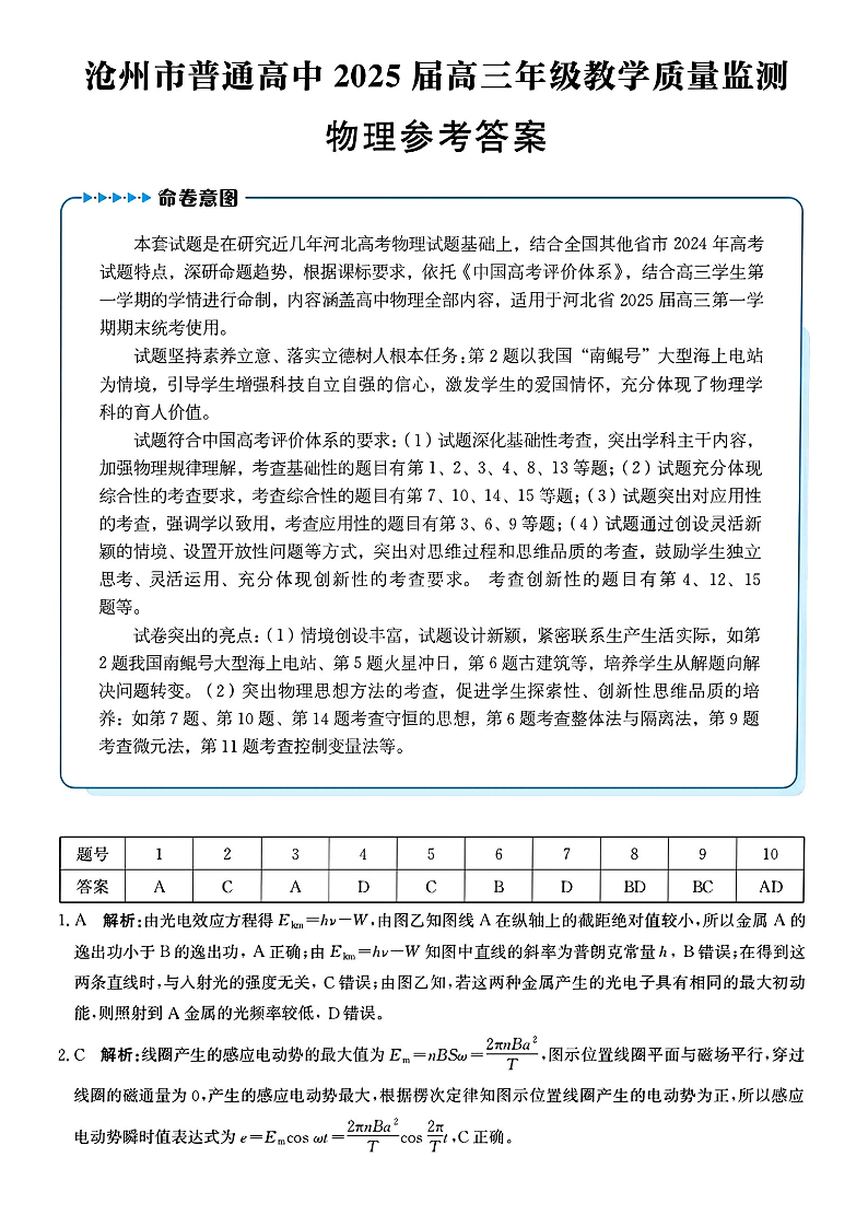 河北省沧州市2024-2025学年高三上学期12月教学质量监测物理答案.pdf