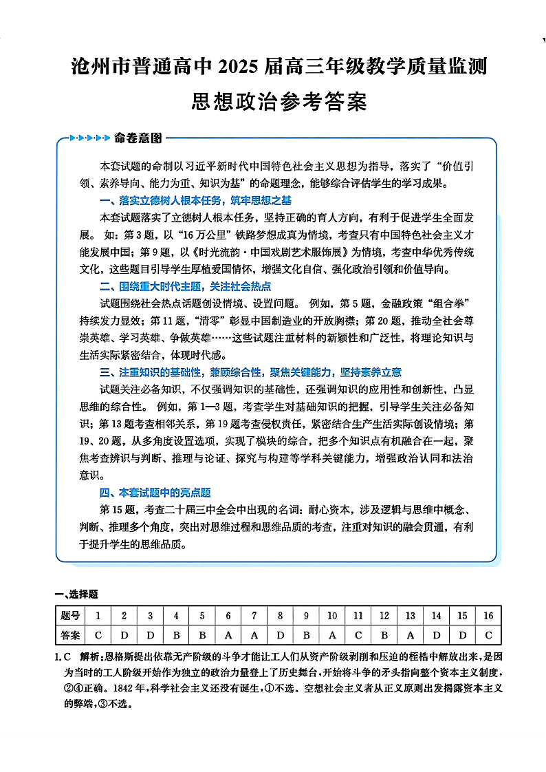 河北省沧州市2024-2025学年高三上学期12月教学质量监测政治答案.pdf