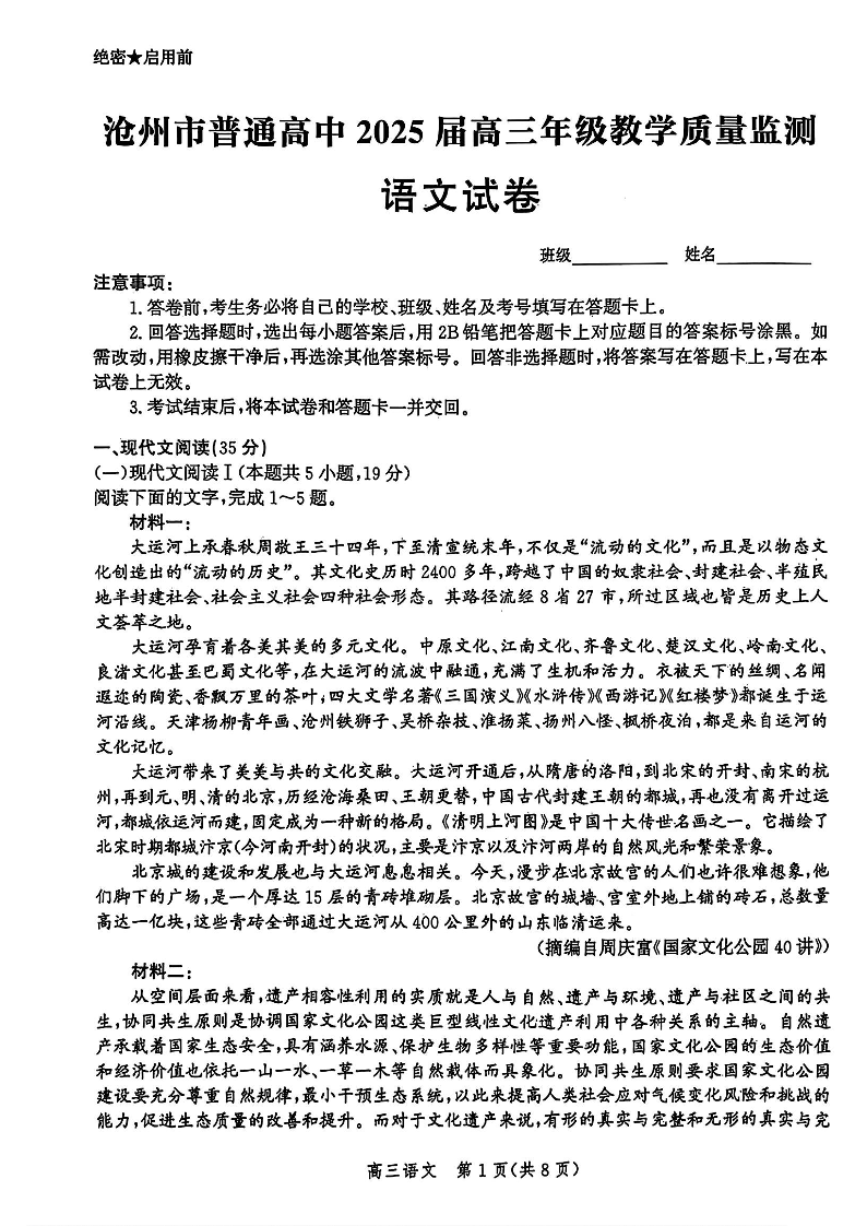 河北省沧州市2024-2025学年高三上学期12月教学质量监测历史语文+答案.pdf