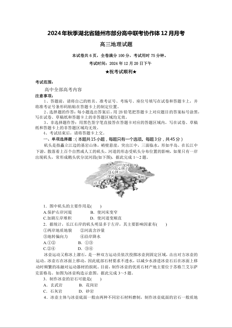 湖北省随州市部分高中联考协作体2024-2025学年高三上学期12月联考地理试题.docx