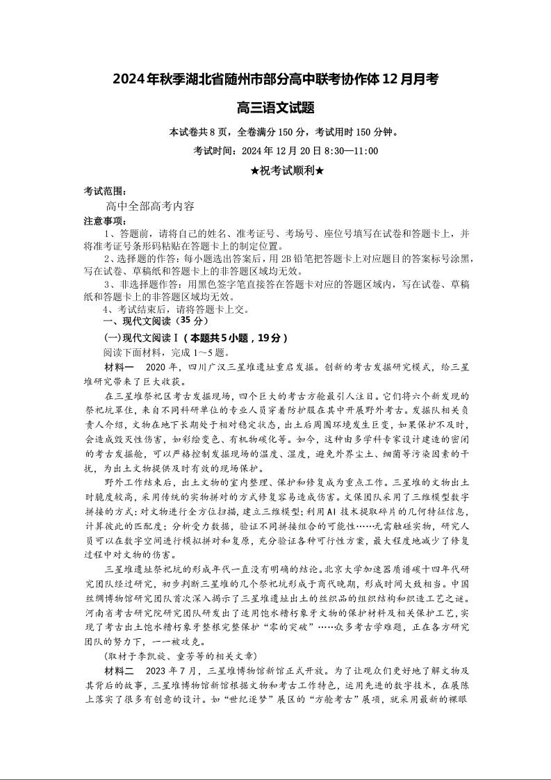 湖北省随州市部分高中联考协作体2024-2025学年高三上学期12月联考语文试题.docx