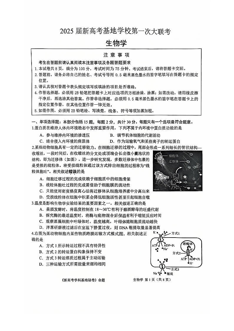 【生物试题+答案】江苏省南通市新高考基地学校2024-2025学年高三上学期第一次大联考.pdf