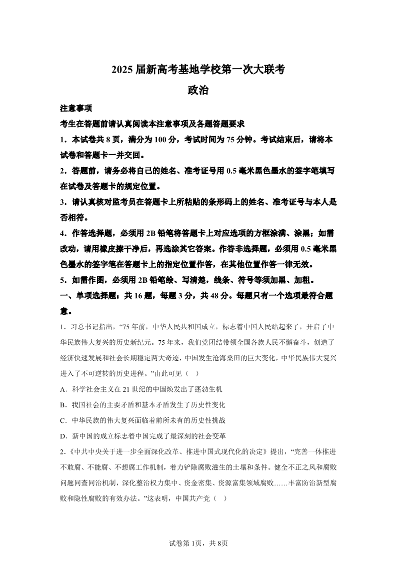 【政治试题+答案】江苏省南通市新高考基地学校2024-2025学年高三上学期第一次大联考.pdf