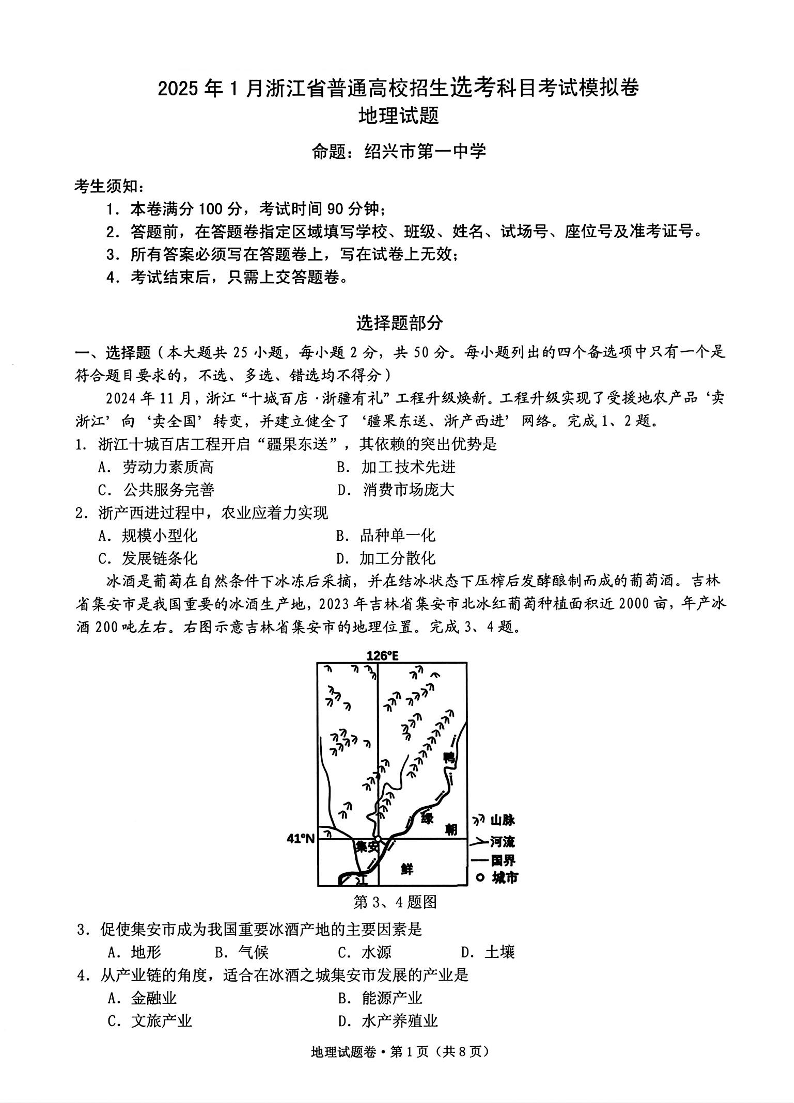 地理试卷-2025届浙江省五校联盟高三12月首考模拟.pdf