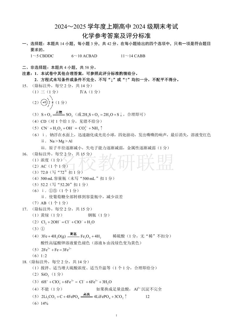 四川省成都市蓉城名校联盟2024-2025学年高一上学期期末考试 化学答案.pdf
