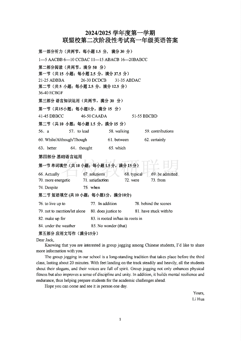 江苏省盐城市五校联考2024-2025学年高一上学期12月月考 英语答案.pdf