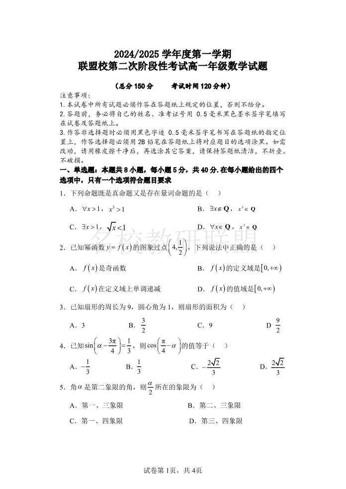 江苏省盐城市五校联考2024-2025学年高一上学期12月月考 数学.pdf