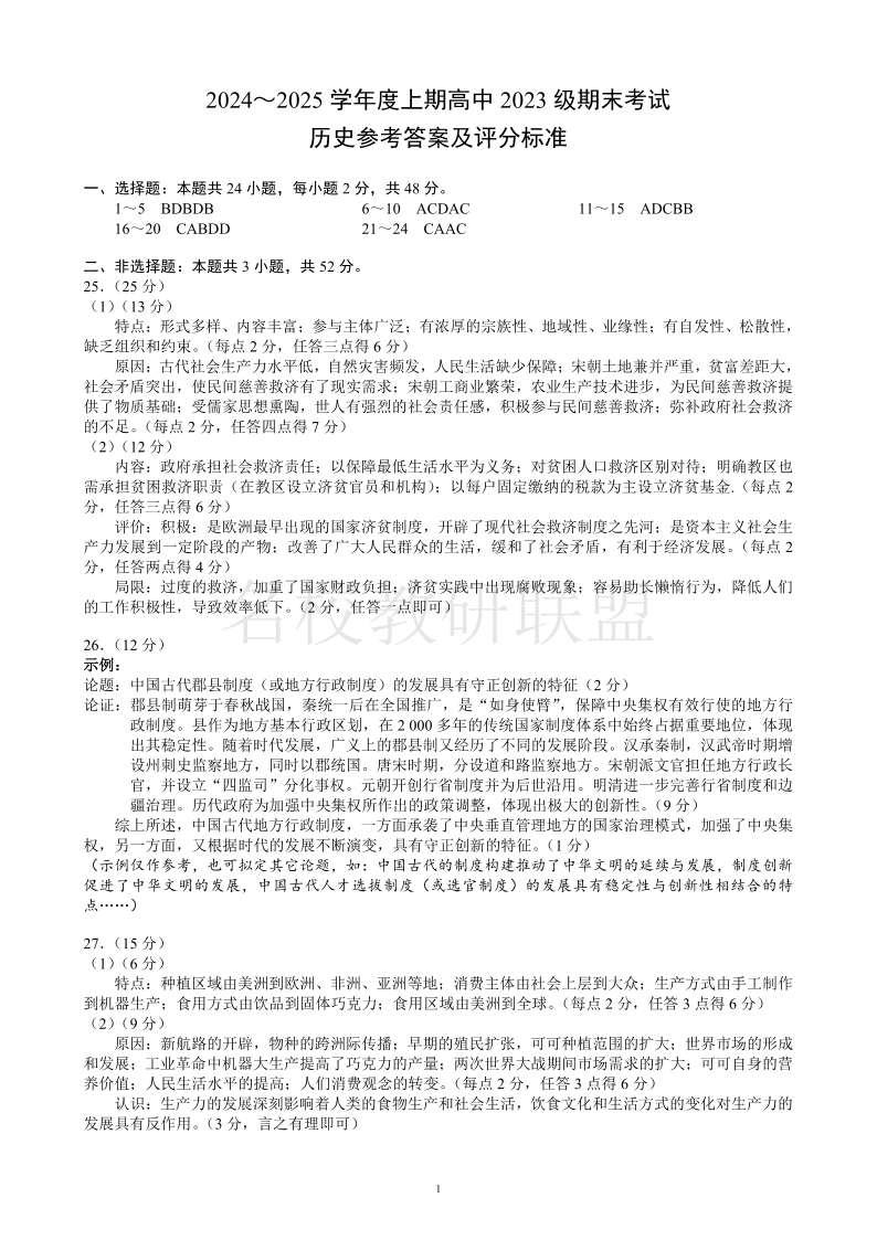 四川省成都市蓉城名校联盟2024-2025学年高二上学期期末考试 历史答案.pdf