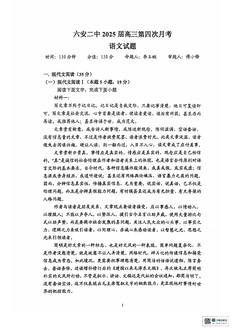 安徽省六安第二中学2025届高三上学期12月第四次月考 语文.pdf