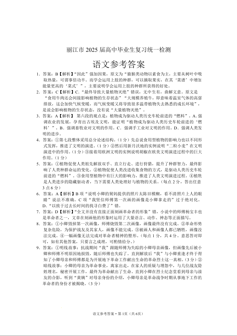云南省丽江市2024-2025学年高中毕业生复习统一检测(12月)语文答案.docx