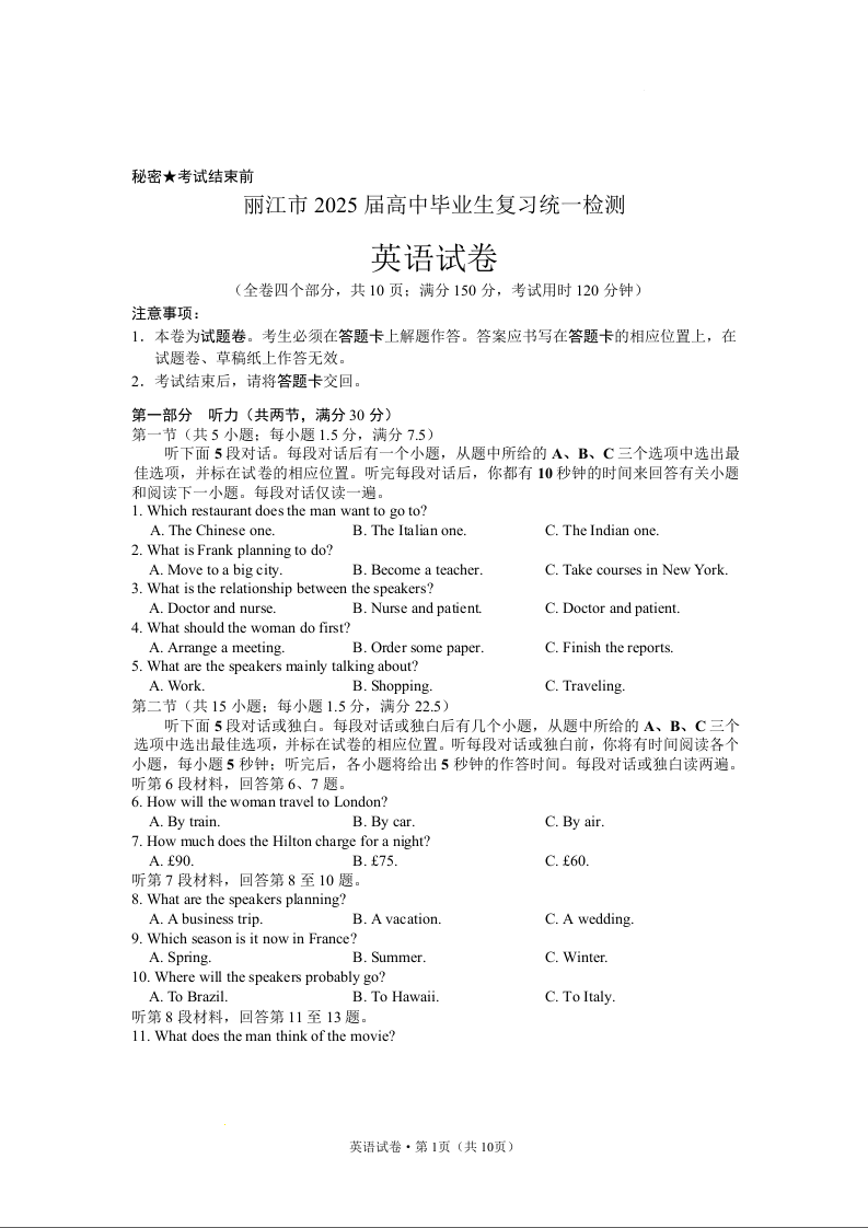 云南省丽江市2024-2025学年高中毕业生复习统一检测(12月)英语.docx