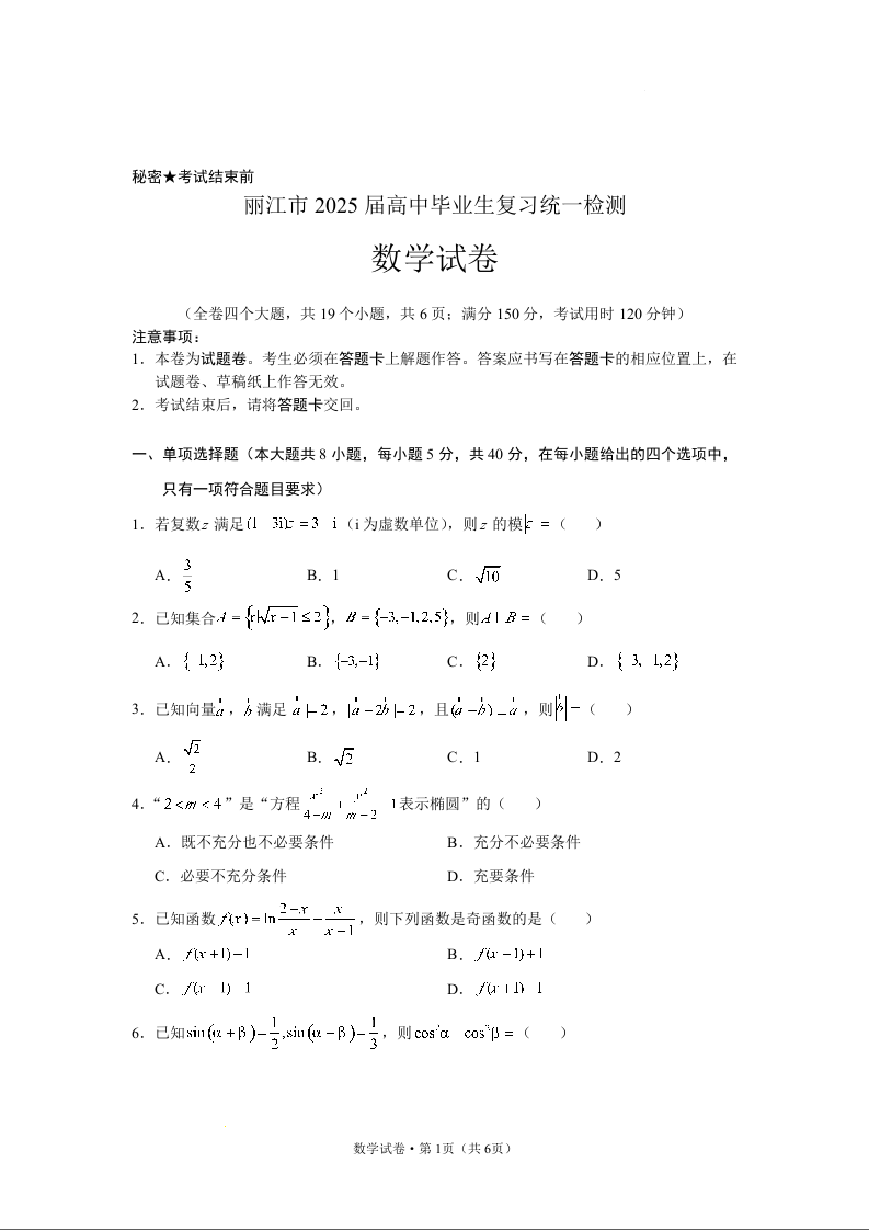 云南省丽江市2024-2025学年高中毕业生复习统一检测(12月)数学.docx