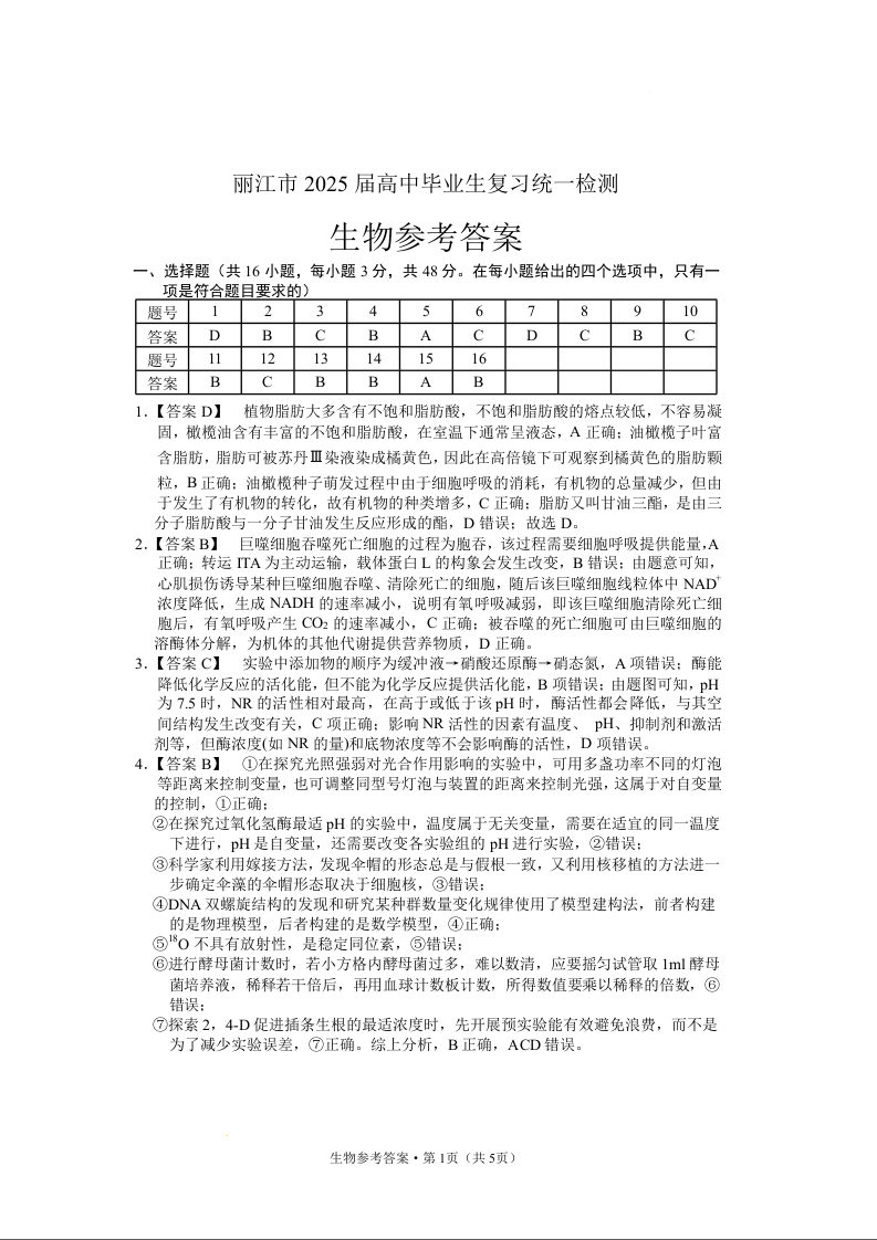 云南省丽江市2024-2025学年高中毕业生复习统一检测(12月)生物答案.docx