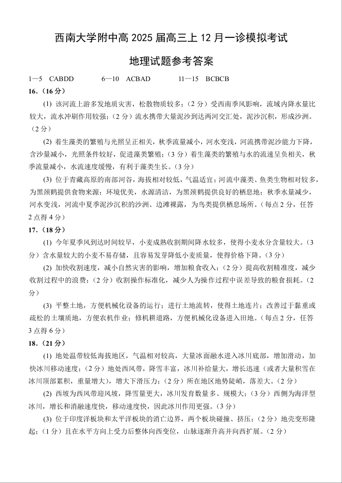重庆市西南大学附属中学2025届高三一诊模拟考试 地理答案.docx