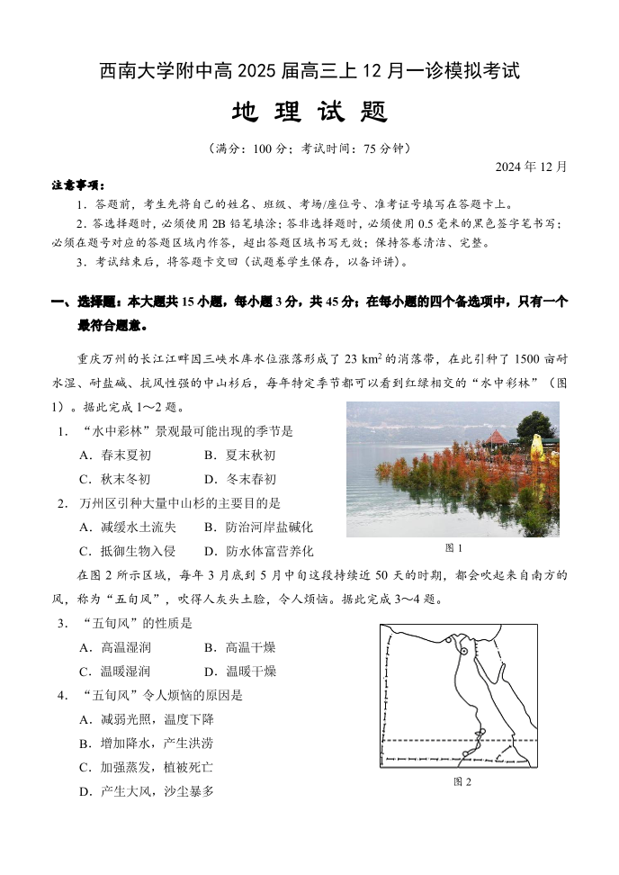 重庆市西南大学附属中学2025届高三一诊模拟考试 地理.pdf