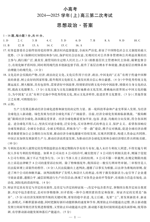 河南省天一大联考小高考2024-2025学年(上)高三第二次考试 政治答案.pdf