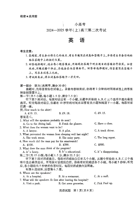 河南省天一大联考小高考2024-2025学年(上)高三第二次考试 英语.pdf