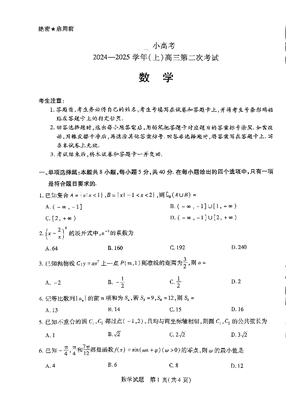 河南省天一大联考小高考2024-2025学年(上)高三第二次考试 数学.pdf