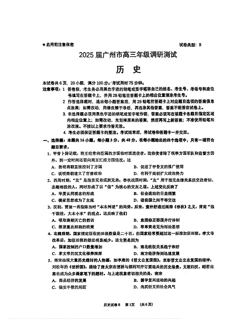 广东省2025届广州市高三年级调研测试(广州零模)历史.pdf