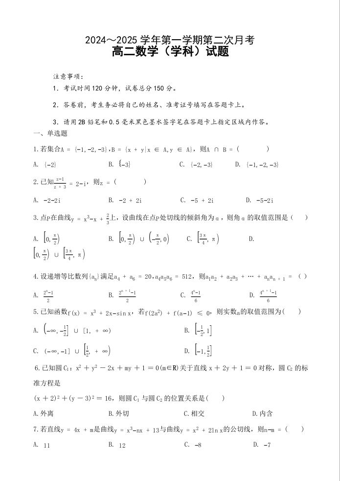 江苏省连云港市2024-2025学年高二上学期12月月考 数学.docx