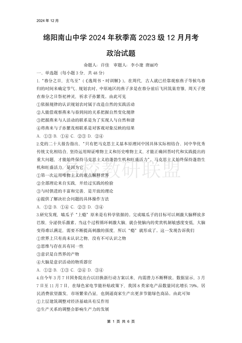 四川省绵阳南山中学2024年秋季高2023级12月月考 政治.pdf