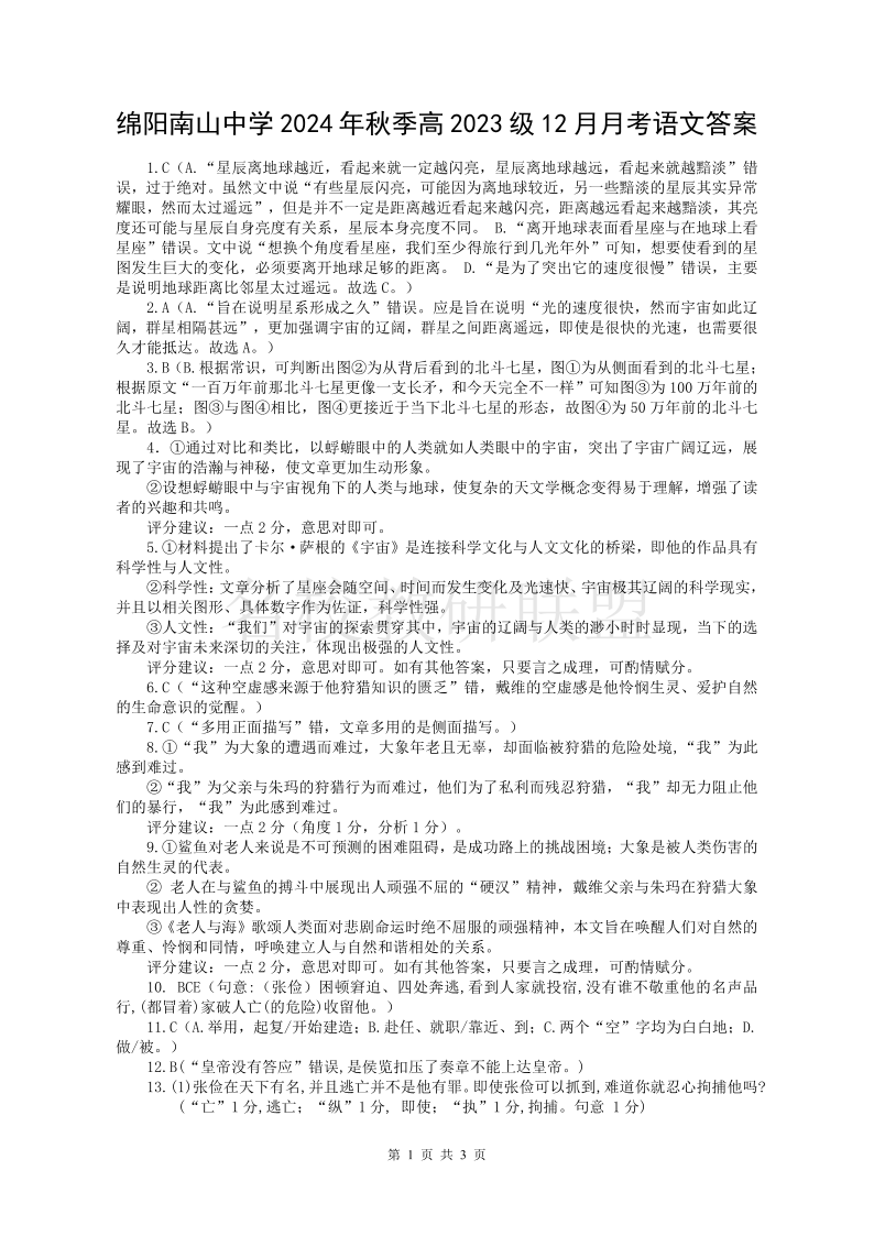 四川省绵阳南山中学2024年秋季高2023级12月月考 语文答案.pdf