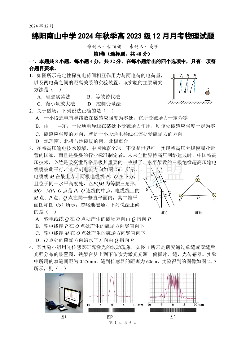 四川省绵阳南山中学2024年秋季高2023级12月月考 物理.pdf