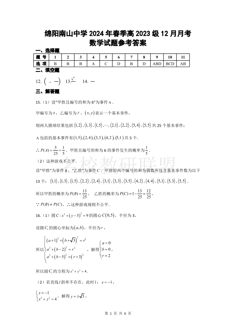 四川省绵阳南山中学2024年秋季高2023级12月月考 数学答案.pdf