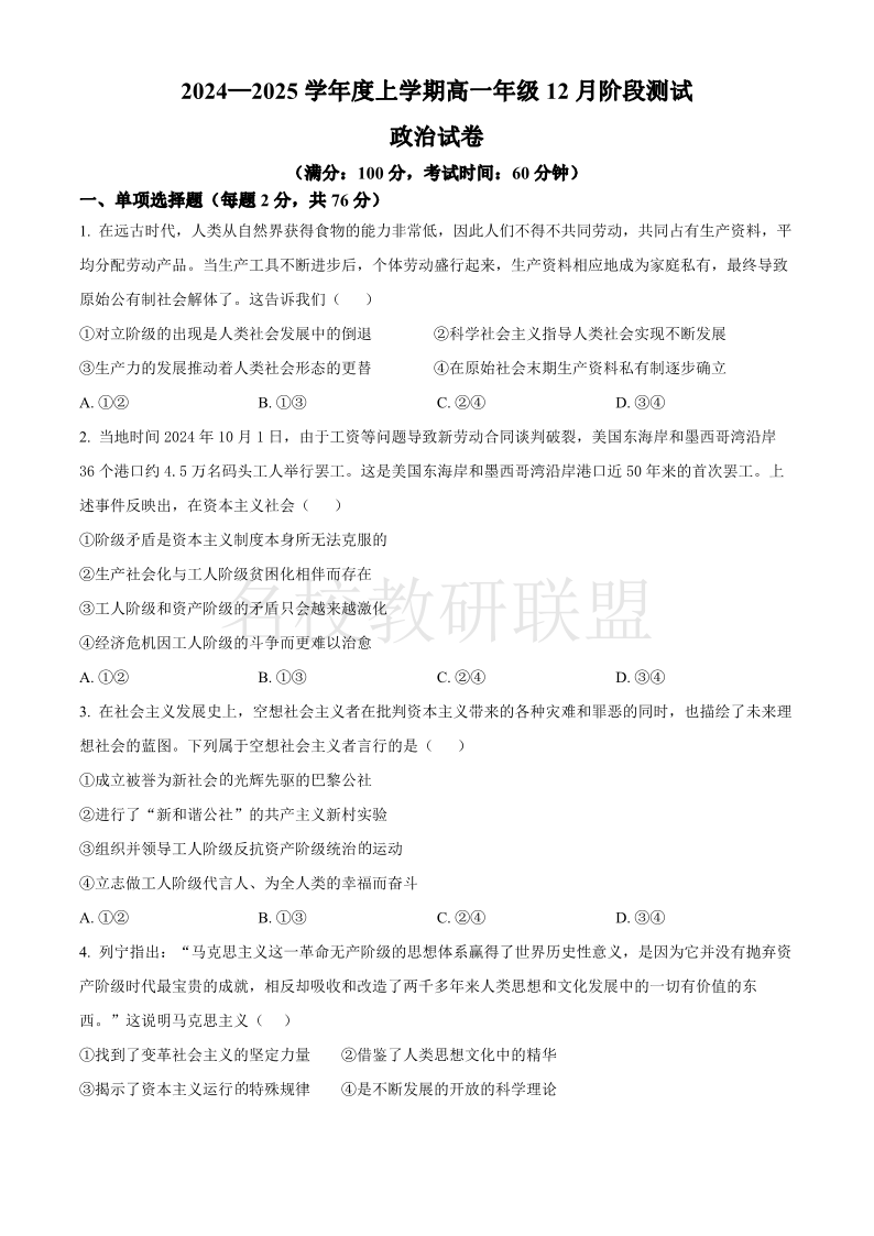辽宁省大连市第八中学2024-2025学年高一上学期12月月考 政治.pdf