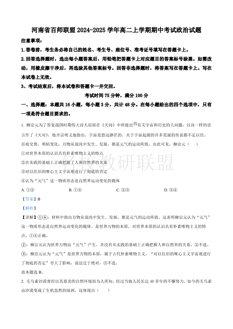 河南省百师联盟2024-2025学年高二上学期期中考试 政治答案.pdf