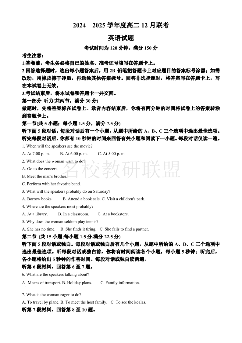 河南省百师联盟2024-2025学年高二上学期期中考试 英语答案.pdf