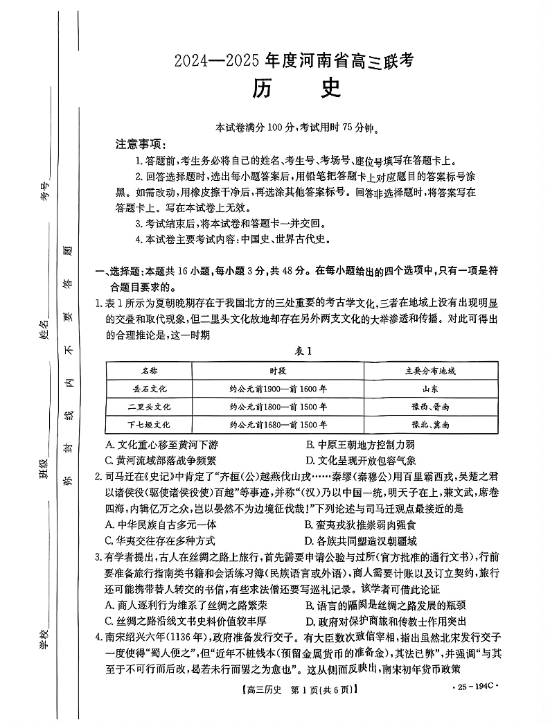 河南省2024-2025学年高三上学期联考 历史.pdf