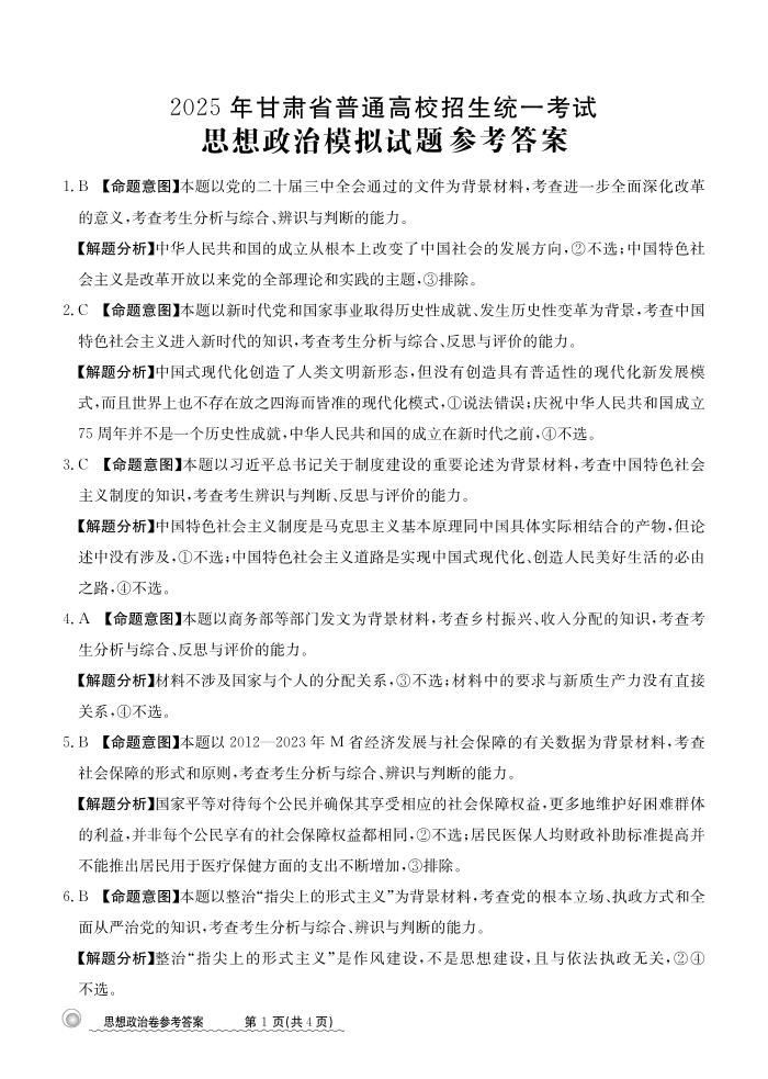 甘肃省白银市靖远县第一中学2025届高三12月模拟考 政治答案.pdf