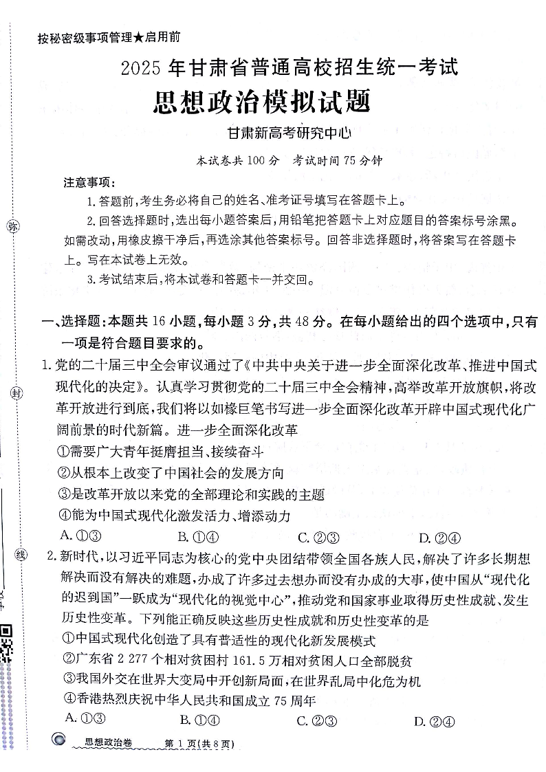 甘肃省白银市靖远县第一中学2025届高三12月模拟考 政治.pdf
