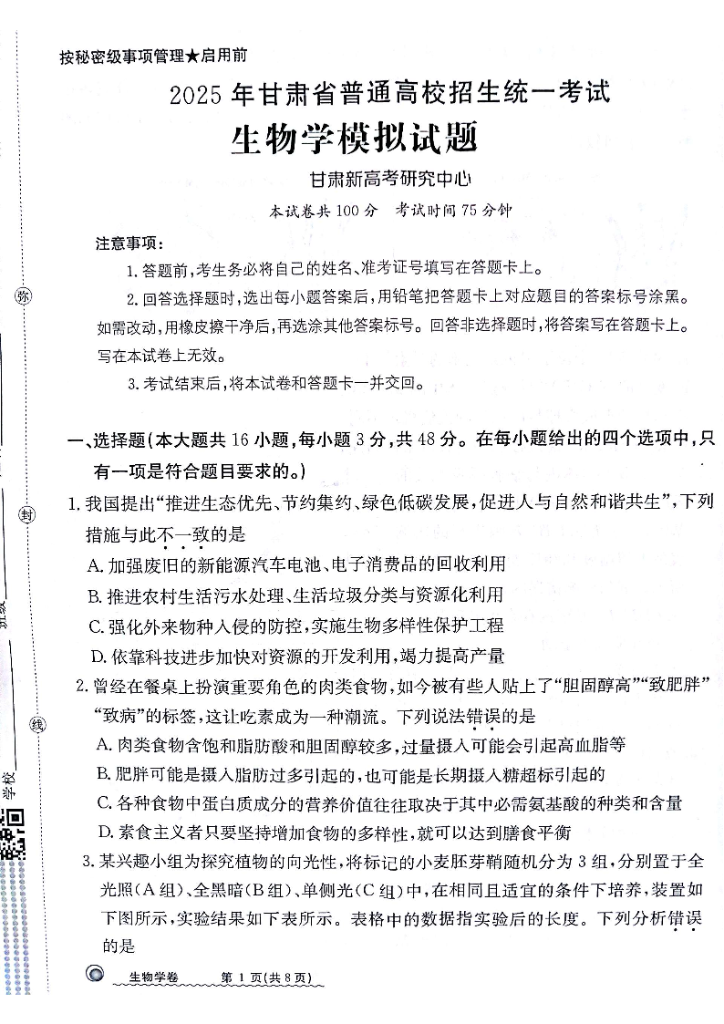 甘肃省白银市靖远县第一中学2025届高三12月模拟考 生物.pdf