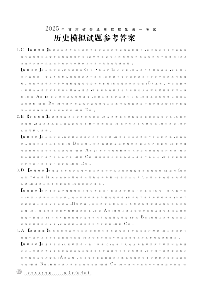 甘肃省白银市靖远县第一中学2025届高三12月模拟考 历史答案.pdf