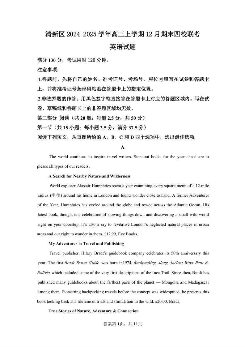 广东省清远市清新区2025届高三上学期12月期末四校联考 英语.docx