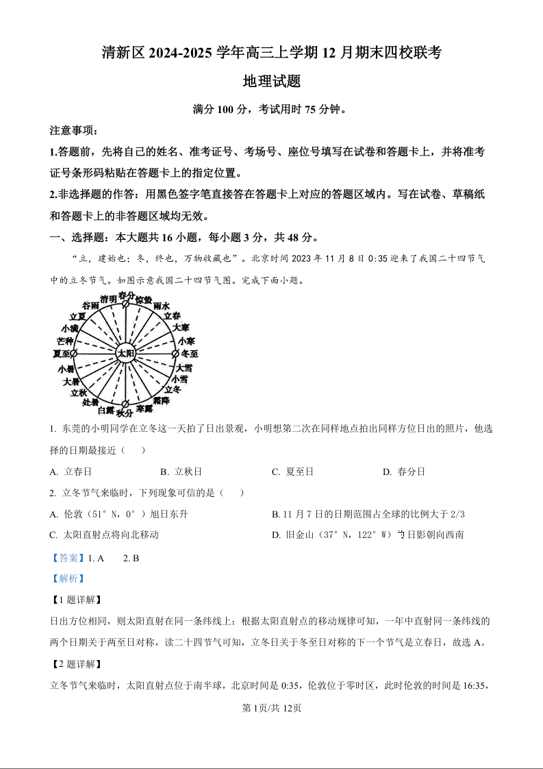 广东省清远市清新区2025届高三上学期12月期末四校联考 地理答案.docx