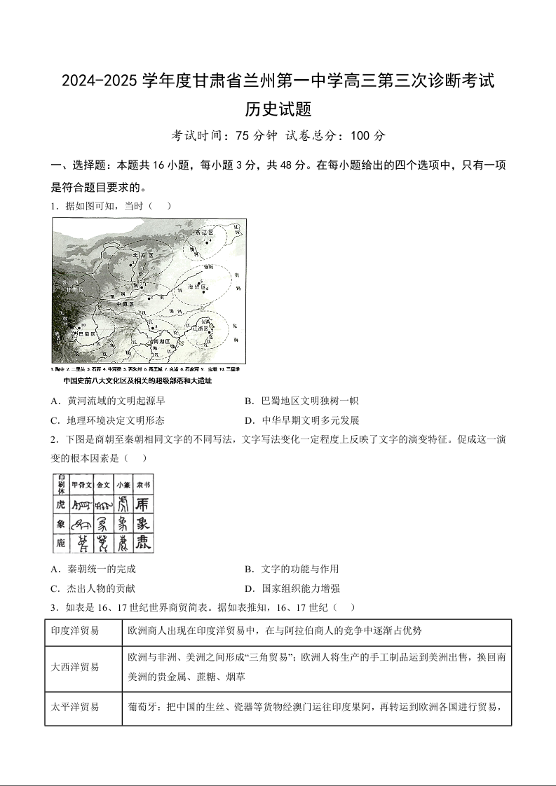 甘肃省兰州第一中学2024-2025学年高三上学期第三次诊断考试 历史.docx