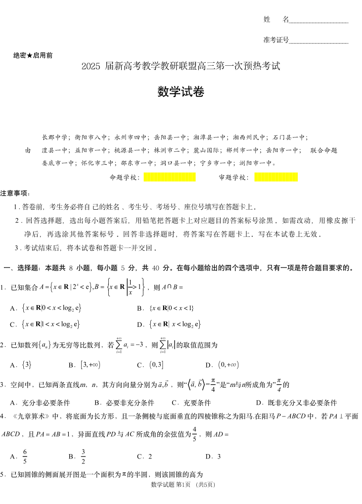 湖南省2025届新高考教学教研联盟高三第一次预热考试 数学.pdf