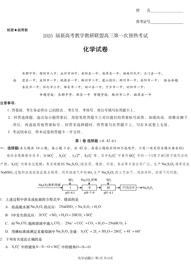 湖南省2025届新高考教学教研联盟高三第一次预热考试 化学.pdf