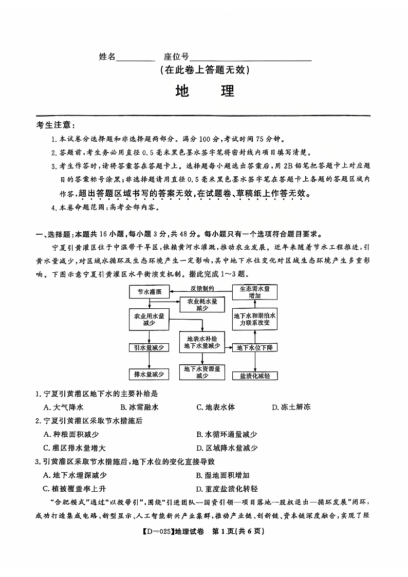 安徽省皖江名校2025届高三上学期12月质量检测 地理.pdf