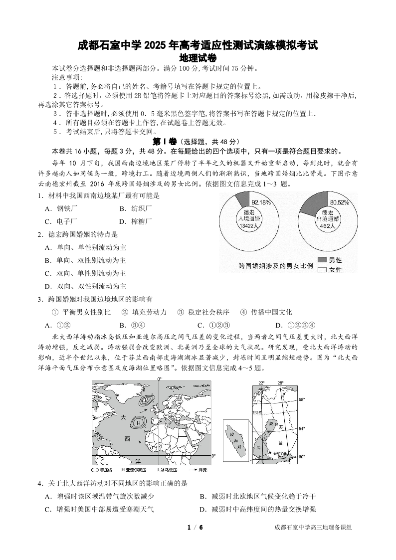 成都石室中学 2025 年高考适应性测试演练模拟考试 地理.pdf