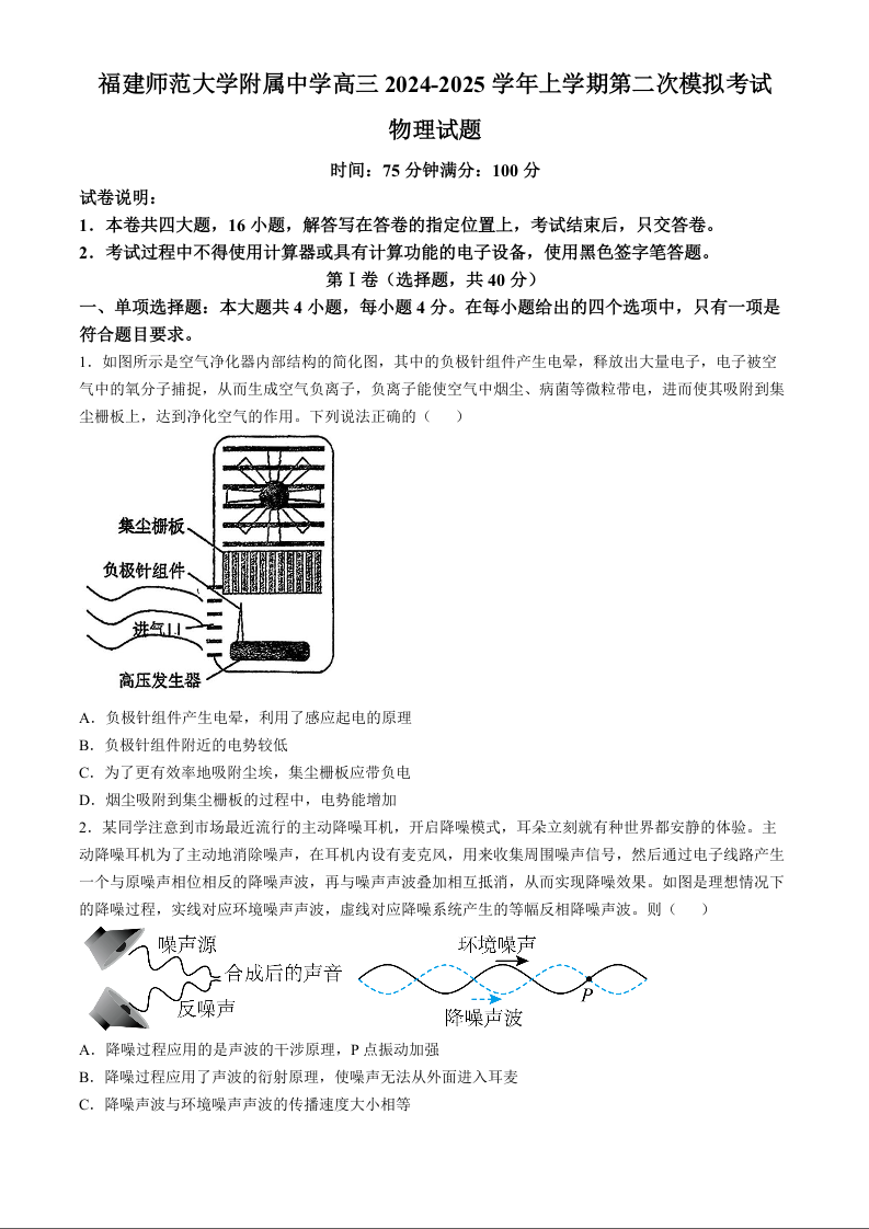 福建师范大学附属中学2024-2025学年度高考12月模拟考试 物理.docx