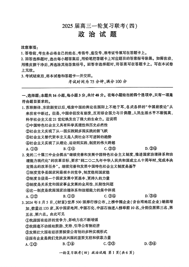 百师联盟2025届高三一轮复习联考(四)政治.pdf