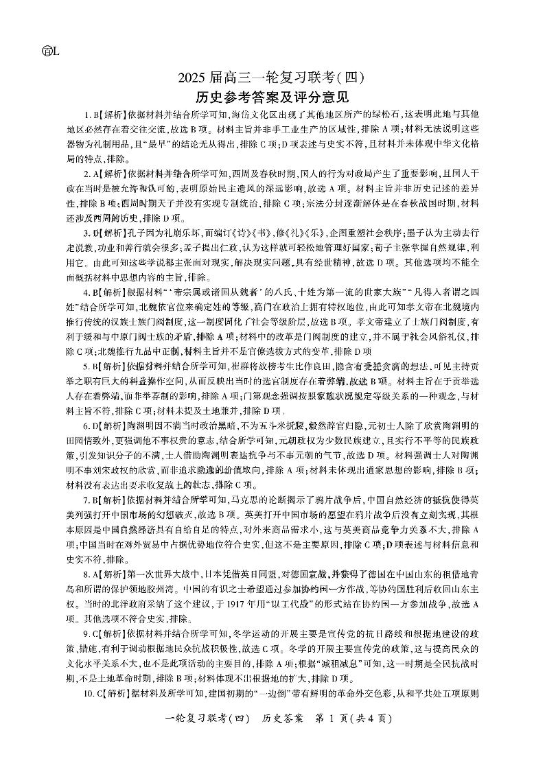 百师联盟2025届高三一轮复习联考(四)历史答案.pdf