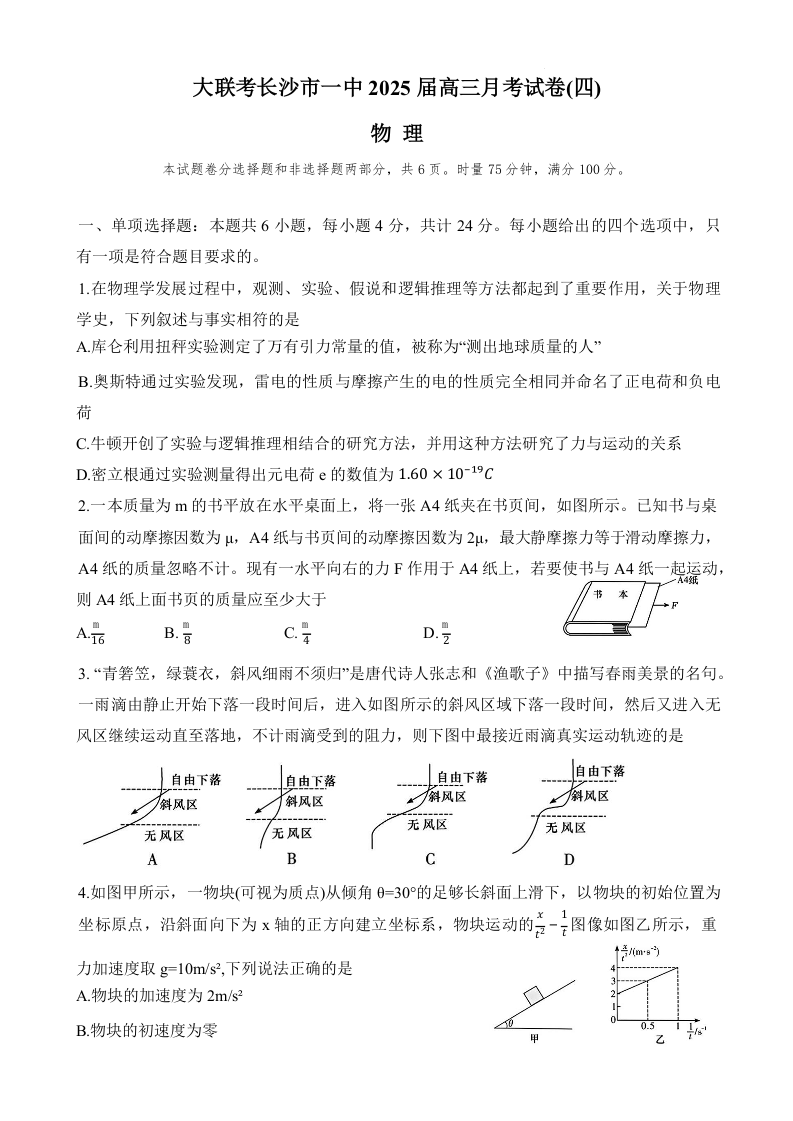 湖南省长沙市第一中学2025届高三上学期月考试卷(四)物理.docx