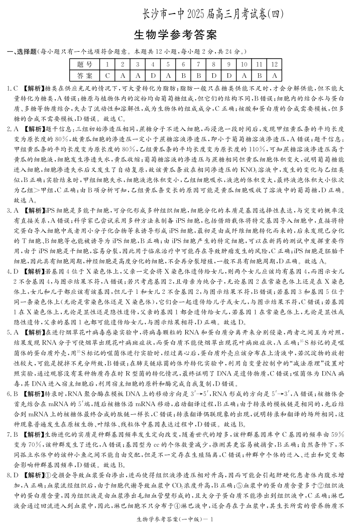 湖南省长沙市第一中学2025届高三上学期月考试卷(四)生物答案.pdf